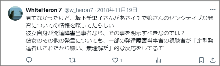 坂下千里子さんが情報番組の中で発達障害についてコメントすることがあったから