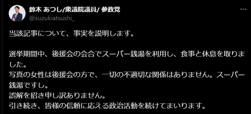 写真の女性は後援会の方で、一切の不適切な関係はありません。スーパー銭湯ですし。