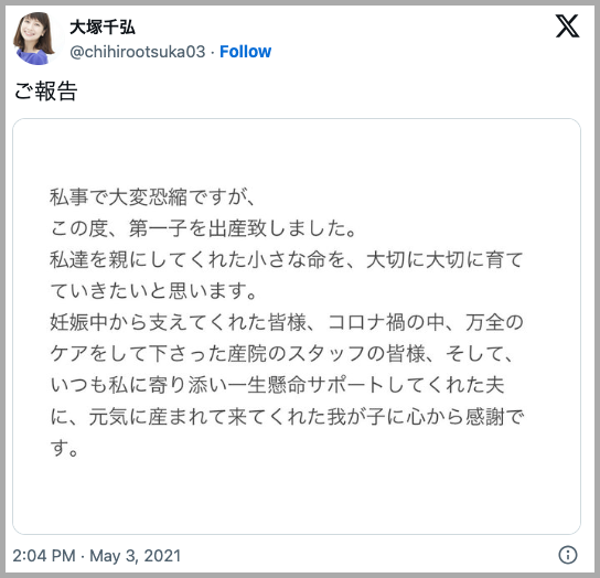 こちらは大塚千弘さんのSNSで発表しているので間違いはないでしょう。
