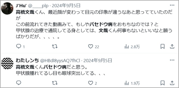 高橋文哉さんの一部のファンの間で噂になっているのが「バセドウ病疑惑」です。
