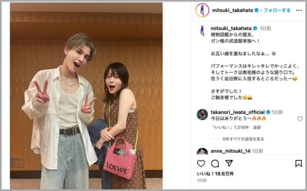 映画撮影後、高畑さんが岩田さんのソロライブ「Takanori Iwata LIVE TOUR 2024 “ARTLESS”」のファイナル公演を観覧し、Instagramに二人のツーショットも投稿しています。