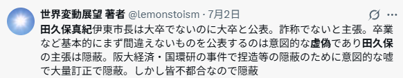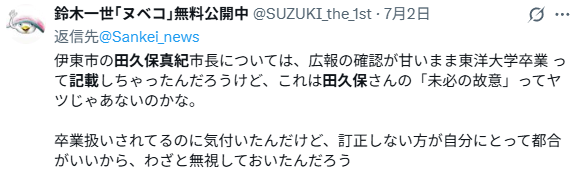 2019年の市議会議員選挙と2025年の市長選挙において、明確に「東洋大学法学部卒業」と記載された選挙公報が有権者に配布されており、これは明らかな虚偽の情報提供となっています。