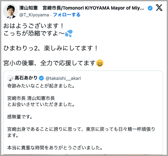 髙石あかりさんが宮崎市長を務める清山知憲さんと面会した際、清山市長は以下のようにSNSで発言していました↓