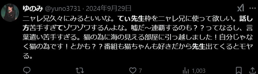 てぃ先生は、女性的な話し方で、イントネーションや語尾回しも独特ですよね。