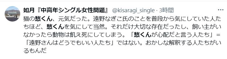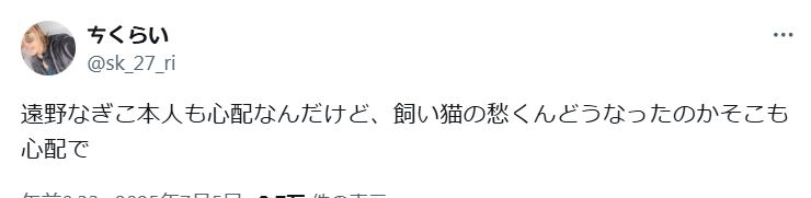 世間では、遠野なぎこさんの愛猫・愁くんの身を案じる声が多数あがっています。