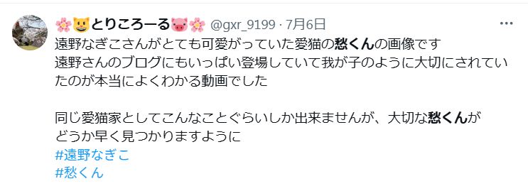 《【遠野なぎこさんの愛猫・愁くんの所在について、ご存知の方おられませんか】