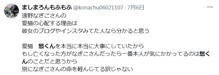 遠野なぎこさんの愛猫・愁くんについては、心配の声が多くあがっていました。