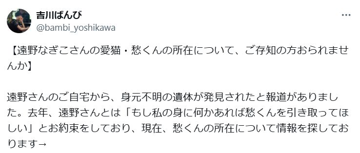 遠野さんのご自宅から、身元不明の遺体が発見されたと報道がありました。去年、遠野さんとは「もし私の身に何かあれば愁くんを引き取ってほしい」とお約束をしており、現在、愁くんの所在について情報を探しております》
