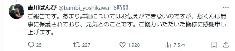 前述したように、吉川ばんびさんが愁くんの所在について、SNSで情報提供を呼び掛けていましたね。