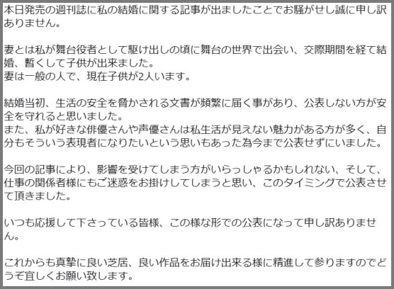 「結婚当初、生活の安全を脅かされる文書が頻繁に届く事があり、公表しない方が安全を守れると思いました。また、私が好きな俳優さんや声優さんは私生活が見えない魅力がある方が多く、自分もそういう表現者になりたいという思いもあった為今まで公表せずにいました」