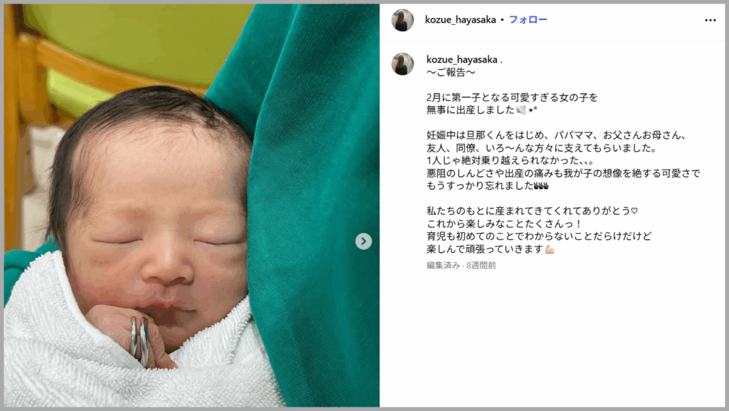 早坂梢依さんがご自身のSNSで「第一子となる可愛すぎる女の子を無事に出産しました」と報告されています。