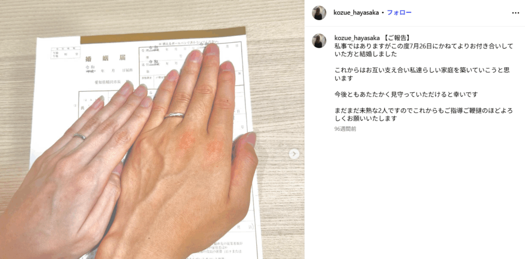 「この度7月26日にかねてよりお付き合いしていた方と結婚しました。 これからはお互い支え合い私達らしい家庭を築いていこうと思います」