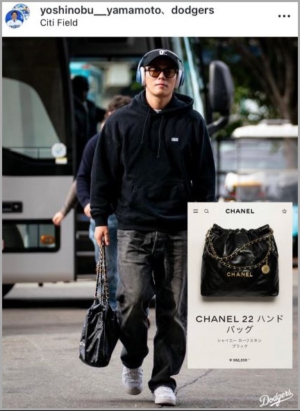山本由伸さんは2024年10月にシティーフィールドに登場した時「シャネル22」のバッグを持っていました。